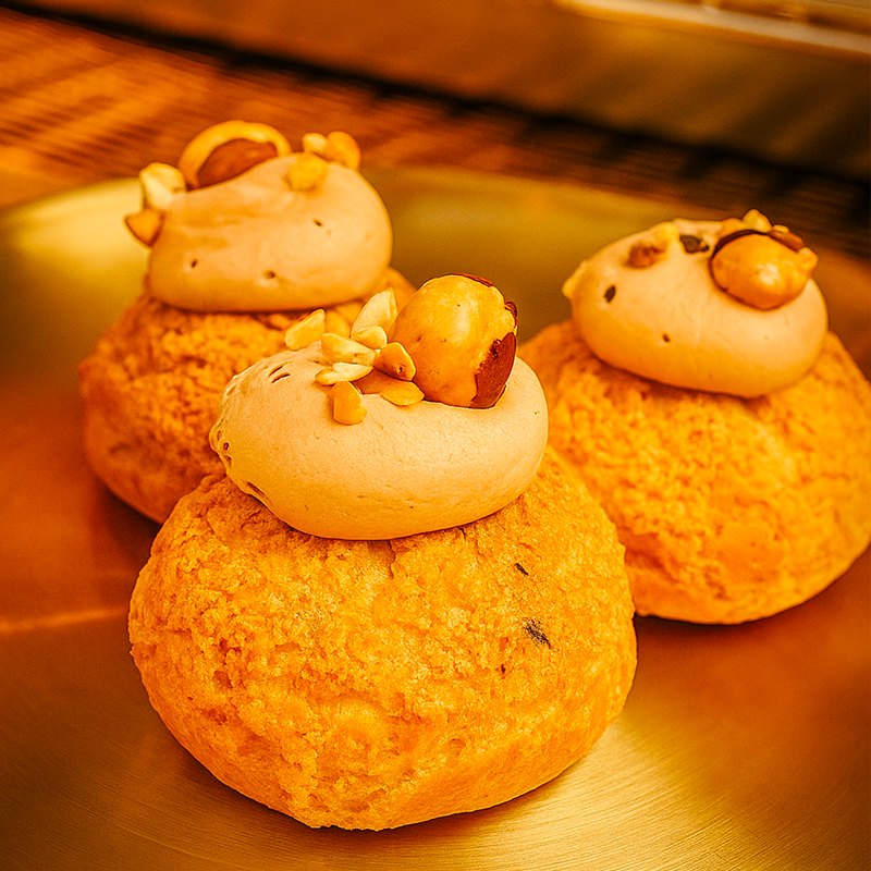 Celui-là, il va faire parler de lui...Chou snickers, généreusement garnis d'une crème chocolat au lait et cacahuète. Recouvert de cacahuètes torréfiées qui le rend très gourmand, les enfants l'adorent, les grands aussi !!!