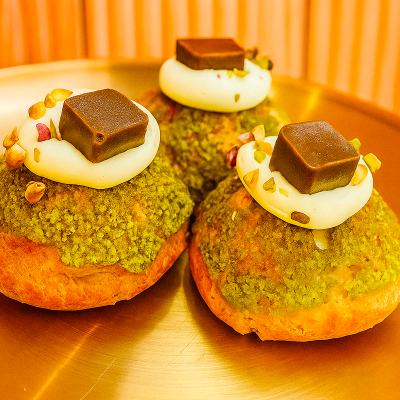Composé d'un crémeux à la pistache à la fleur d'oranger. Décoré avec une ganache légère aux éclats de pistache et d'un cube croustillant praliné pistache